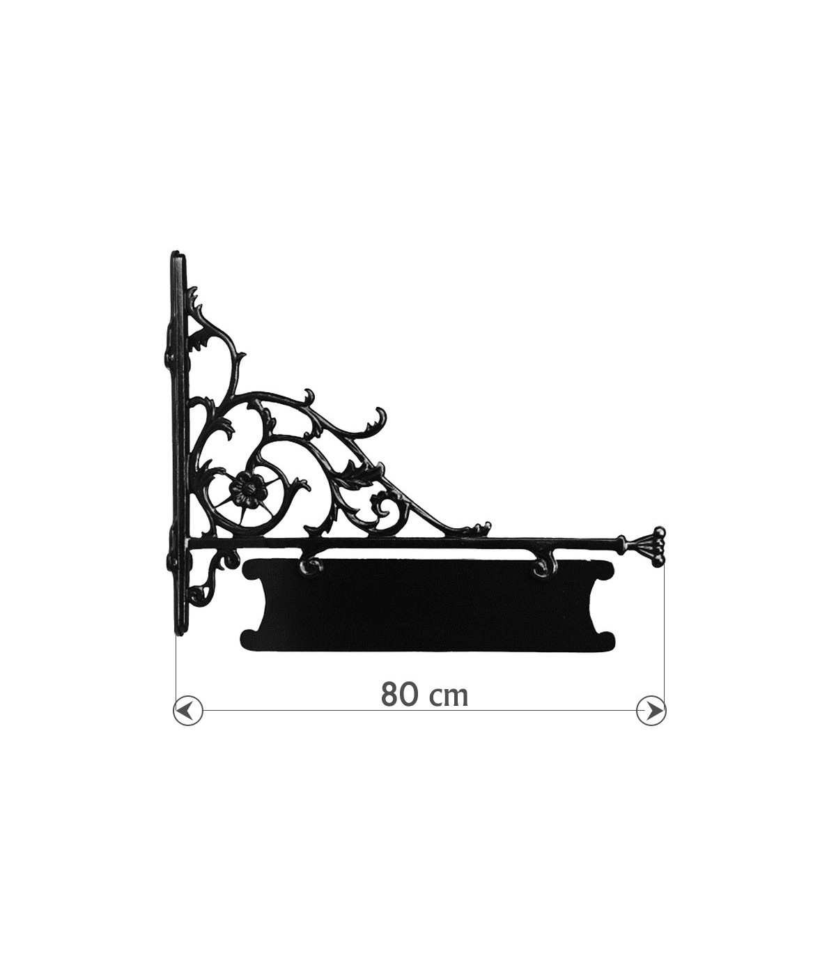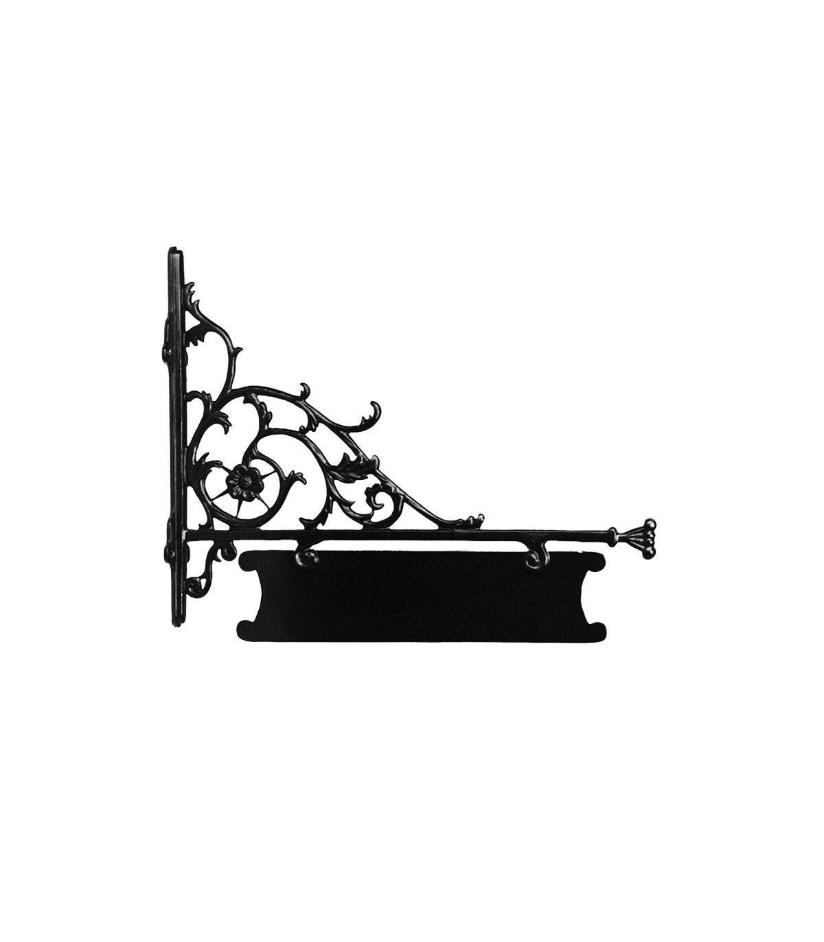 Plaque signalétique façon fer forgé : cette élégante enseigne, au design finement ciselé est destinée à recevoir une information écrite : le nom d'un commerce, une direction à suivre, etc... Couleur : Noir