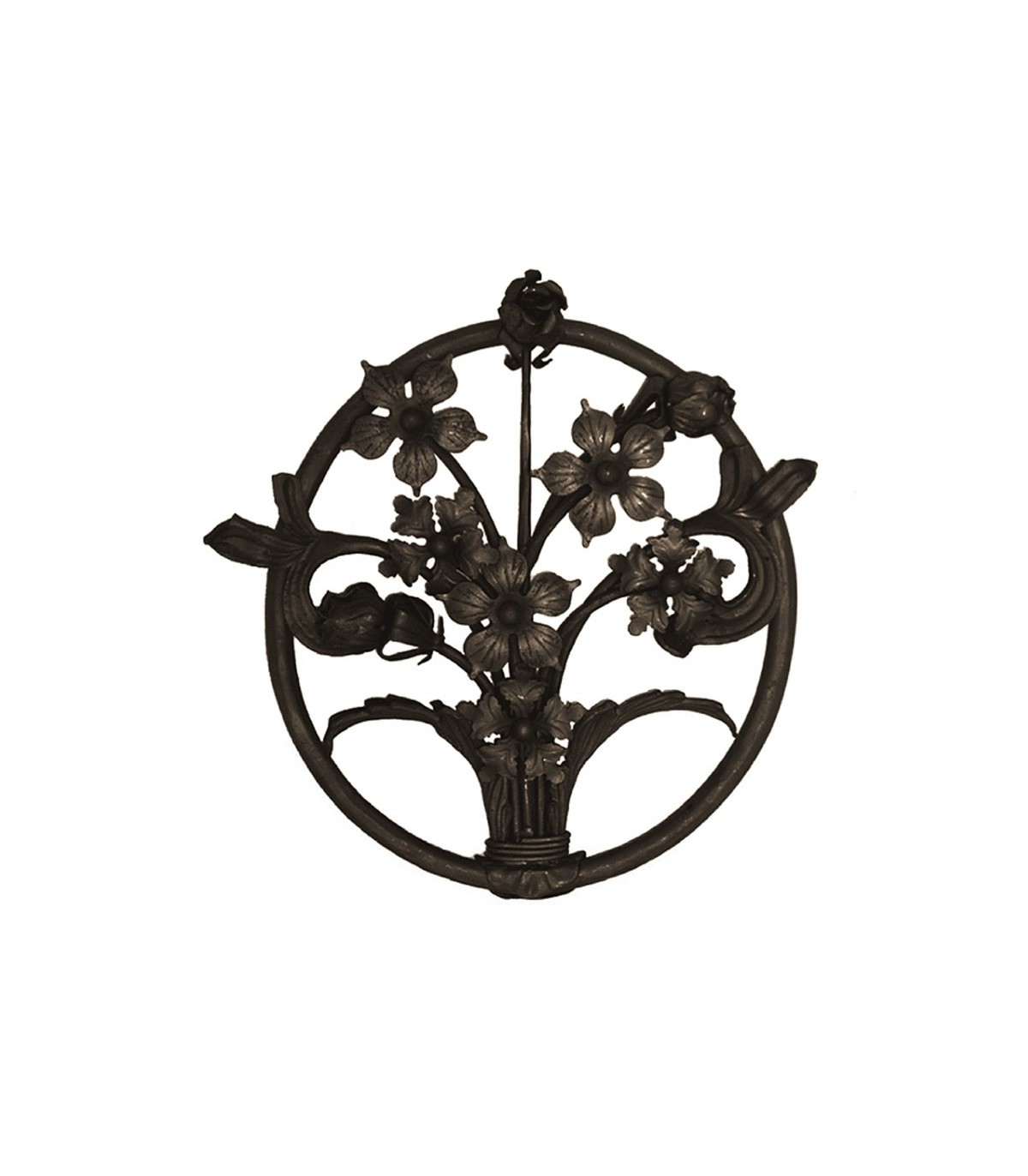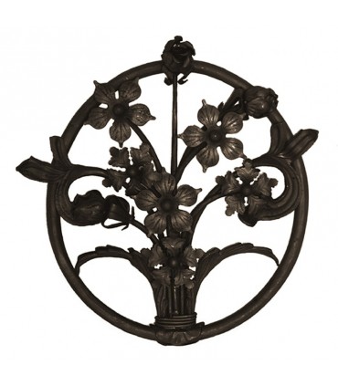 Décoration florale en fer forgé avec un entourage : bouquet de fleurs finement ciselées et entourées d'un cercle.
