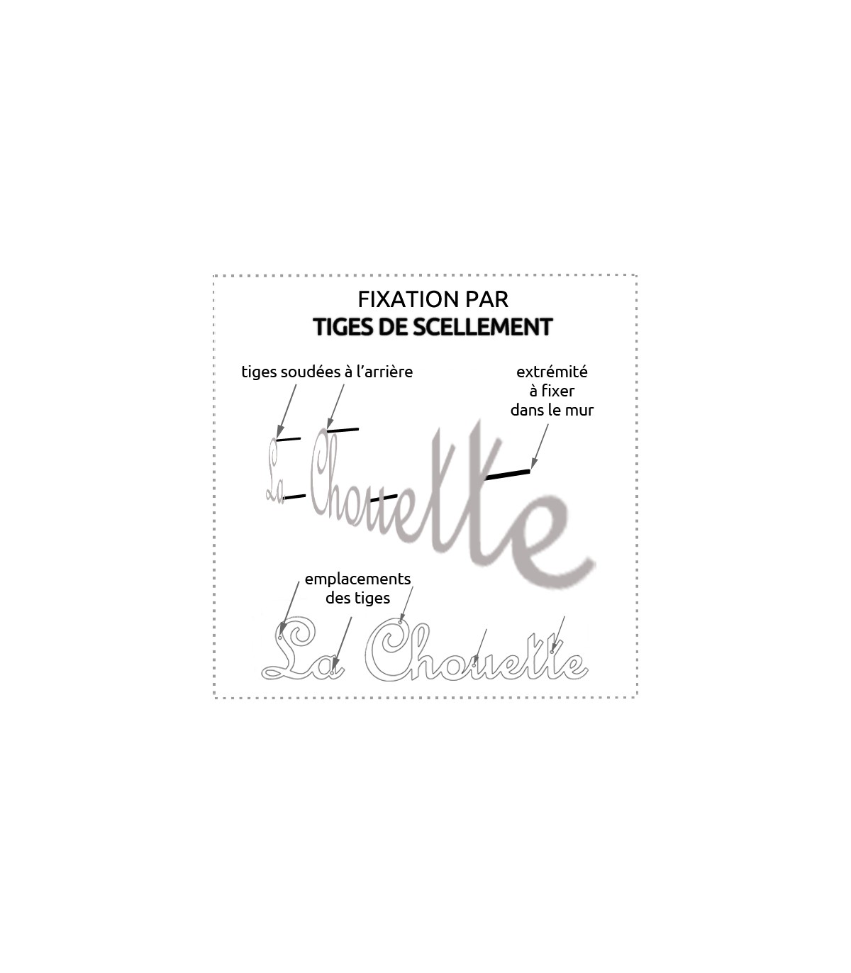 • 2°) Avec tiges de scellement (voir illustrations n°5, 6 et 7) : pour les murs en pierre de taille, un forfait tiges de scellement de 10 cm de longueur est vendu en supplément : 22,00 € par mot attaché (exemple : Soleil d'Eté = 2 mots attachés = 2 forfaits tiges de scellement).